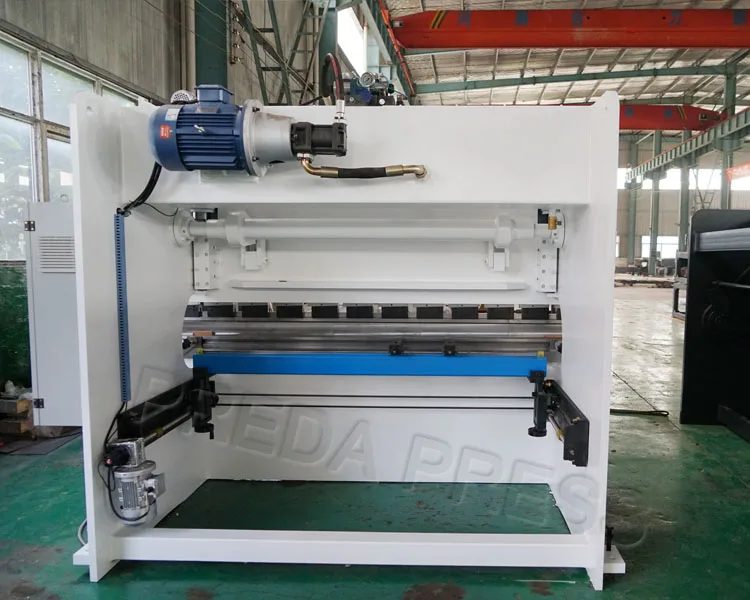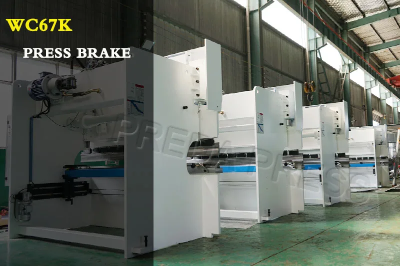 The hydraulic press brake machine comprises a bracket, a worktable and a clamping plate, the worktable is placed on the bracket, the worktable is composed of a base and a pressure plate, and the base is connected with the clamping plate through a hinge, the base is composed of a seat shell, a coil and a cover plate, and the coil It is placed in the recess of the seat shell, and the top of the recess is covered with a cover plate. When in use, the coil is energized by the wire, and after the power is applied, the platen is attracted to the platen, thereby clamping the plate between the platen and the base. Thanks to the electromagnetic clamping, the pressure plate can be made into a variety of workpiece requirements, and the workpiece with the side walls can be processed. (1) Estun E21 NC control system.(2) Powered Depth Y-axis & Back gauge X-axis.(3) DELTA Inverter controlled back gaug.(4) HIWIN Ball screws & Polished rod with 0.01/0.05mm accuracy.(5) Plate Support Arms.(6) Germany Bosch-Rexroth Hydraulic.(7) Germany EMB Tubing connector.(8) Germany Siemens Main Motor.(9) Telemecanique/ Schneider Electrics.(10) Hydraulic & Electrical overload protection.(11) Top and Bottom Tooling (86°,R0.6mm).